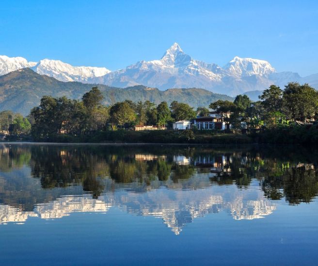 Overnight in Pokhara, a lakeside city known for its serene atmosphere and beautiful mountain views.