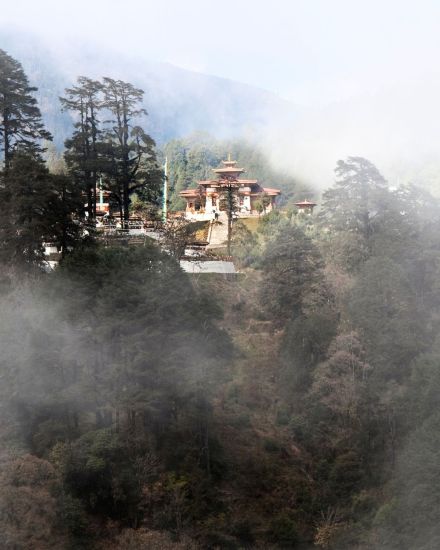 Overnight in Paro, with the peaceful valley and distant hills providing a serene backdrop.