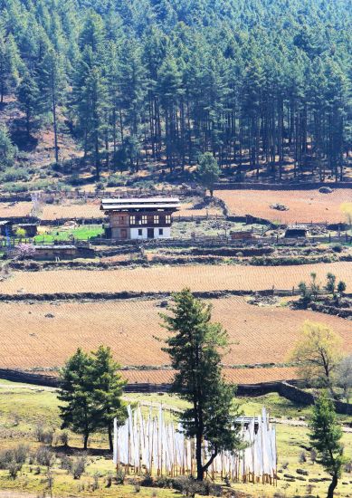 In the morning, take a scenic drive from Thimphu to Phobjikha. This journey leads you across beautiful landscapes of Bhutan, including forested valleys and mountainous terrain, gradually approaching the Phobjikha Valley. Known for its serene environment, the valley is famous as a winter home to the rare black-necked cranes.