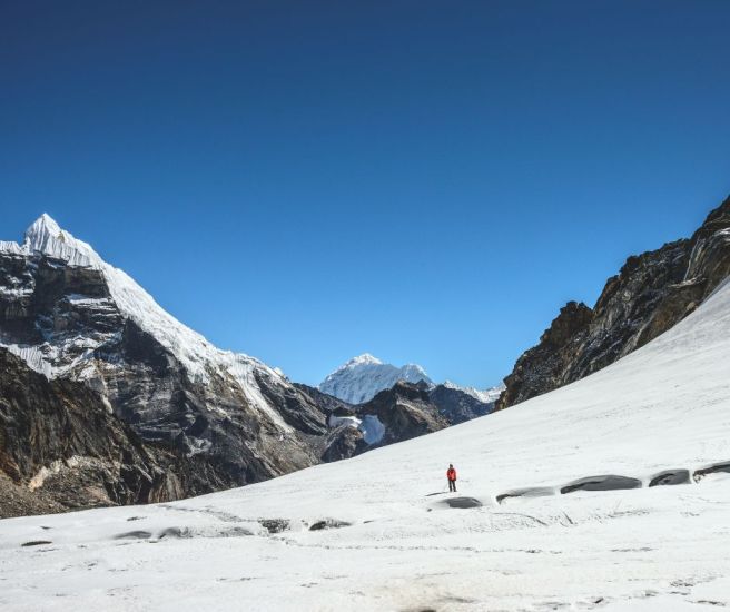 Today’s trek takes us to the challenging peak of Cho La Pass, navigating difficult terrain and glacier moraines. This will be the most demanding day of the journey. If the pass is covered in snow, the ascent becomes particularly tough and risky. After several hours of climbing, we reach the summit of Cho La Pass, where we’re rewarded with breathtaking views of Cho La Lake and Mount Cholatse.