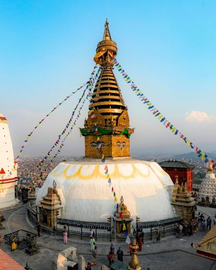 From the hilltop, the site offers a wide panoramic view of the Kathmandu Valley. The contrast between the stillness of the stupa and the spread of the city below adds depth to the experience. The area is also known for its resident monkeys, which move freely around the complex and form a familiar part of the atmosphere.