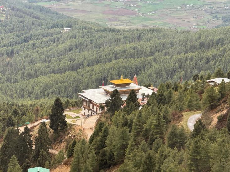 At the top awaits a peaceful monastic complex with around 10 temples and 15 residences, home to monks and long-term meditators. The atmosphere is one of quiet devotion. The views over Thimphu valley are spectacular, wide, clear, and humbling. You can either rest in stillness or walk quietly through the grounds. The experience is both grounding and unforgettable.