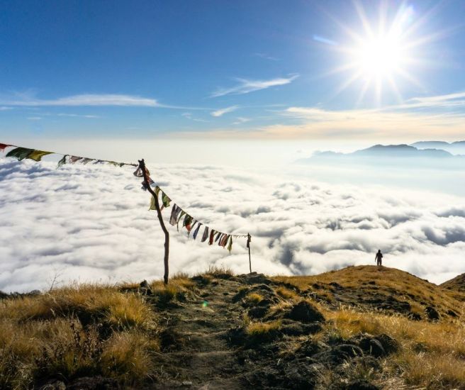 The trek continues with a gradual climb through the dense forest before emerging above the tree line. As you ascend, you will start to witness breathtaking views of the Annapurna range. The transition from dense jungle to open ridges creates a surreal experience, with clouds drifting below you. After approximately 4-5 hours of trekking, you will arrive at Badal Danda (3,210m), which translates to “Cloud Hill.” As the name suggests, this spot often feels like being above the clouds, offering mesmerizing views of Machapuchare and Mardi Himal. The sunset here is particularly stunning, painting the peaks in shades of gold and pink.