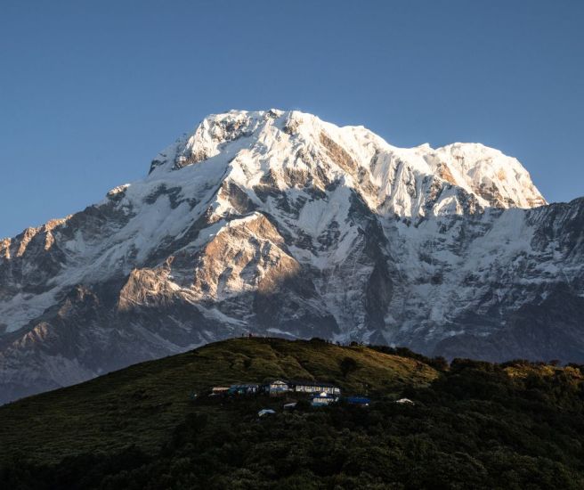 As trekkers climb higher toward High Camp and the Base Camp at around 4,500 metres, the panorama expands dramatically. Annapurna South, Hiunchuli, and Machhapuchhre dominate the skyline, so close that they seem within reach. The ridgeline trail allows continuous views of the valleys far below and the peaks towering above, creating a rare sense of immersion in the Himalayan world.