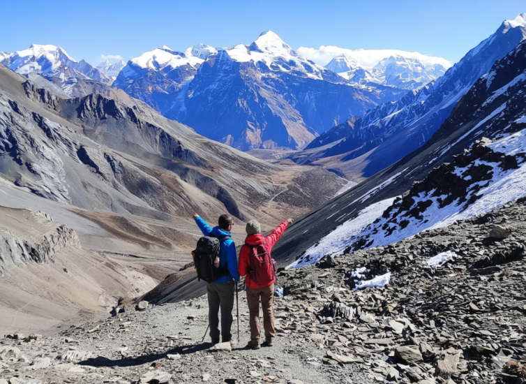 At the pass, the scene is unforgettable: jagged peaks of Annapurna II, Gangapurna, Manaslu, and Tilicho rise in a majestic semicircle, glaciers glinting under the sun, and the valley below stretches into remote, unspoiled wilderness. Trekkers pause here, taking in the dizzying beauty, snapping photos, and feeling the rare thrill of standing at one of Nepal’s most remote high passes.