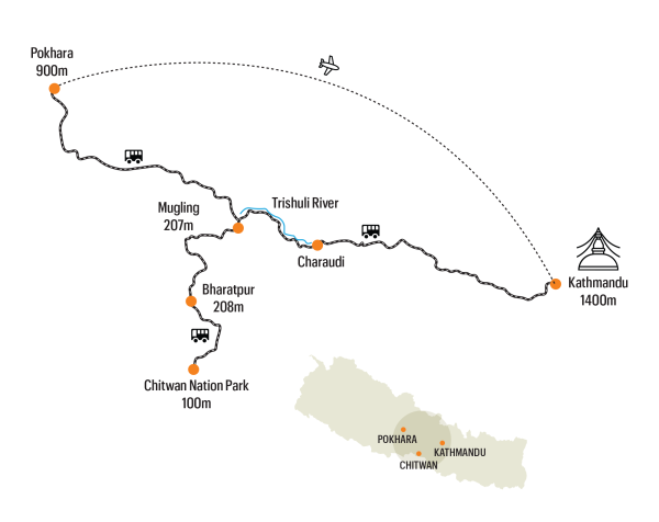 Meals: Kathmandu and Pokhara with breakfast and Chitwan on full board.