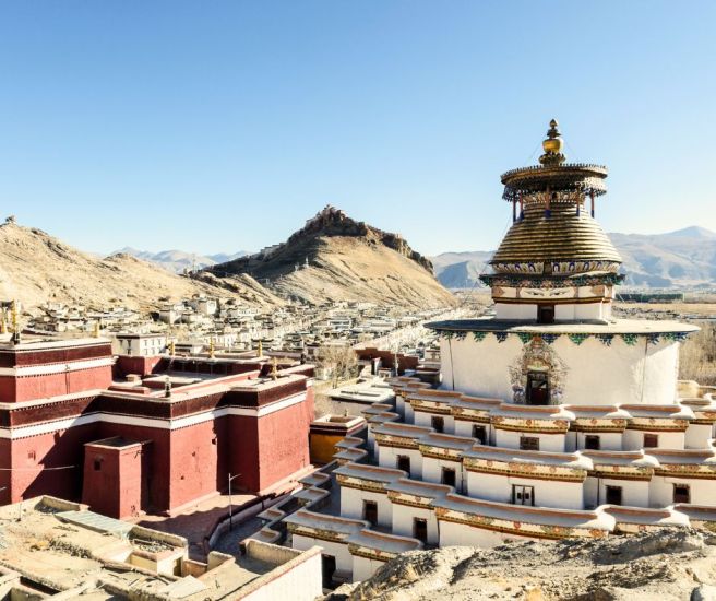 Set off on a breathtaking journey to Gyantse, a town steeped in history. As you drive along winding roads, you will be captivated by the majestic views of Yamdrok Tso, a sacred lake known for its mesmerizing turquoise waters. As you cross two high mountain passes—Kamba La (15,700 feet) and Karo La (16,500 feet)—you’ll be treated to panoramic views of snow-capped peaks and sprawling valleys. Stop to visit Drolma Lakhang and Samding Monasteries, perched by the shore of the lake, offering a serene setting for reflection. Arrive in Gyantse and check into your hotel to relax and enjoy the quiet beauty of this historical town.