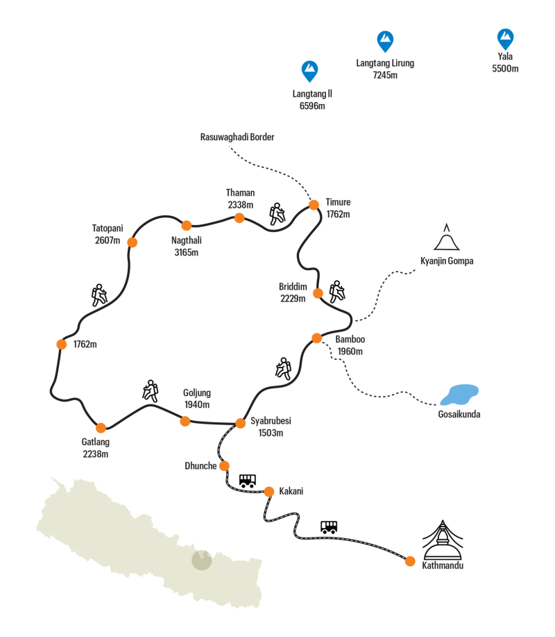 You start the journey from Kathmandu early in the morning and drive towards Syabrubesi, the starting point of the trek. The drive goes through winding roads, offering glimpses of Ganesh Himal, and through small hill towns and the Trishuli River valley.