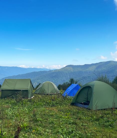 All camping gears that includes-2 person sleeping tents with floors and fly sheet, dinning tent, kitchen tent, toilet tents, dinning tables, chairs, pillows and mattresses.